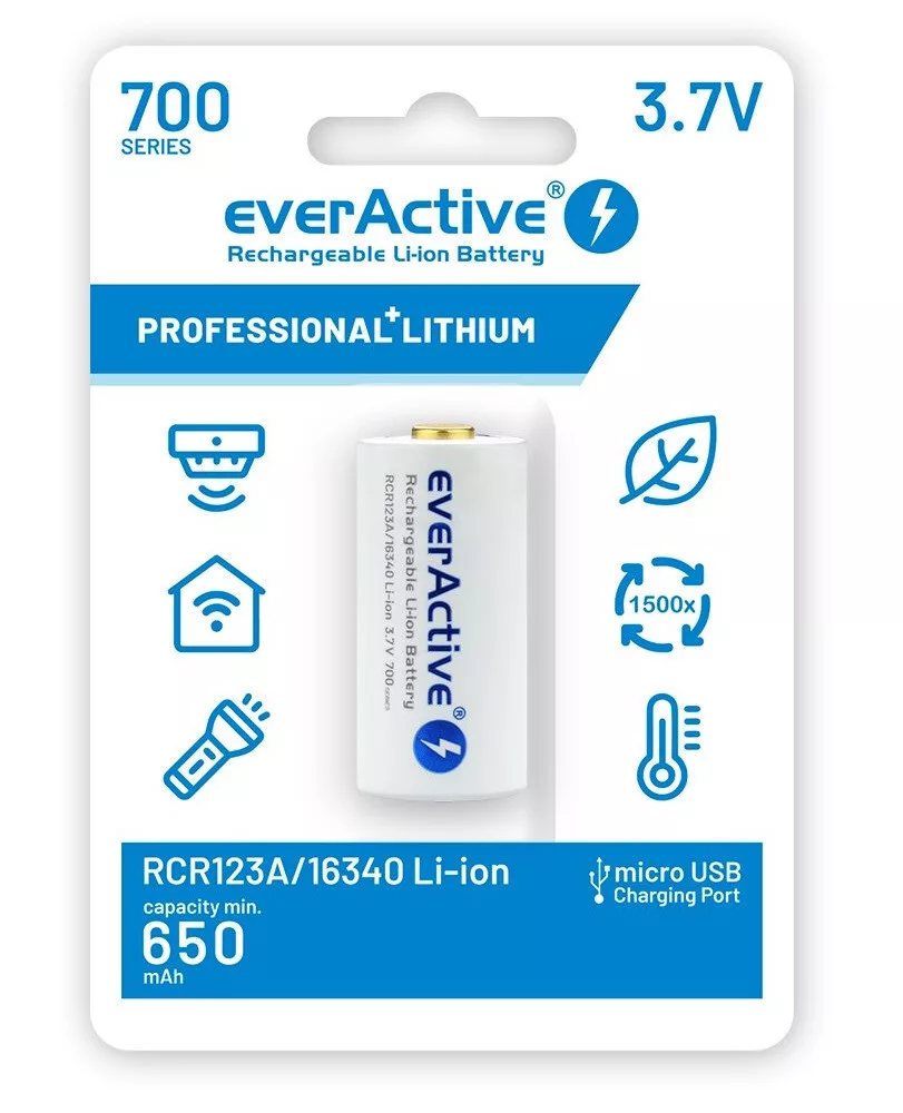 Az everActive RCR123A vagy más néven 16340, micro USB-vel ellátott, 3,7V-os, 650mAh kapacitású és nem utolsó sorban védelemmel ellátott Li-ion akkumulátor. Méret: 16,4 x 34,2 mm Súly: 50 g csomagolással - csomagolás nélkül 19 g.